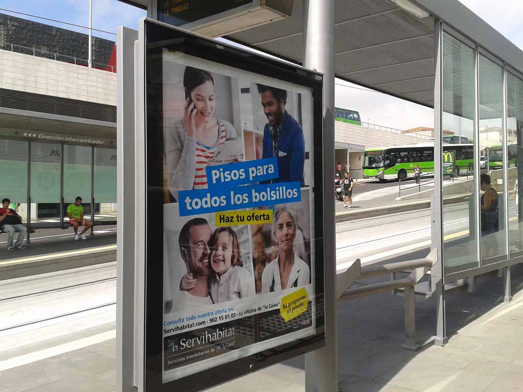 Anuncios visuales en mobiliario urbano, ideales para zonas peatonales y comerciales.
